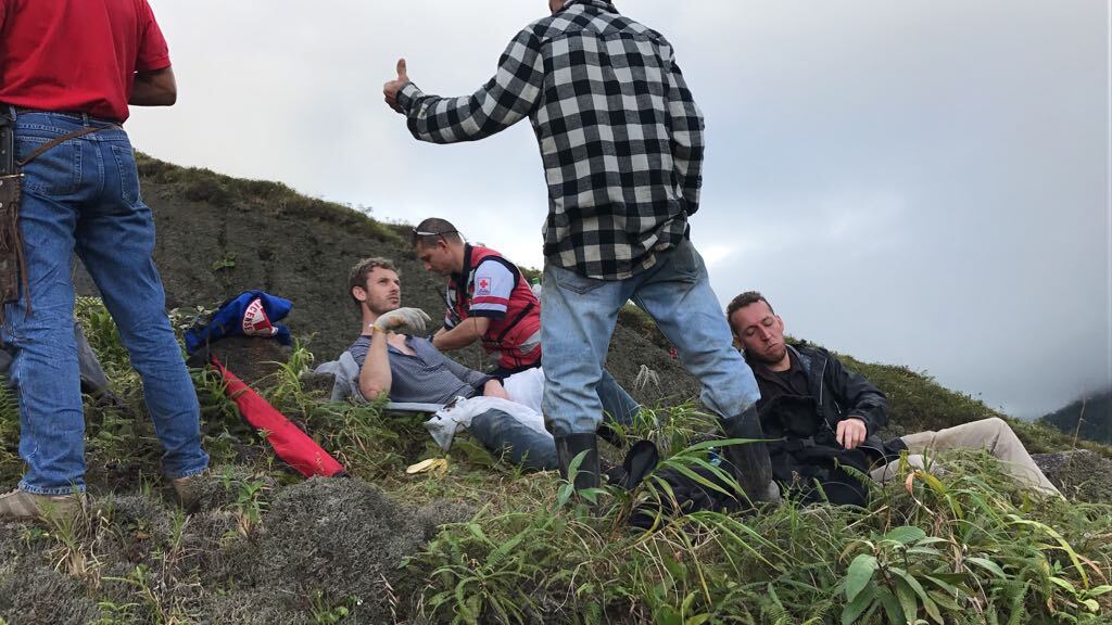 Los europeos resultaron heridos al desprenderse material volcánico. Uno de ellos, no identificado, cayó a una zanja de la que Bomberos y Cruz Roja lograron rescatarlo luego de 13 horas de un trabajo de alto riesgo.