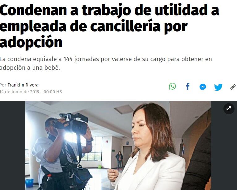 La sentencia la dictó el El Tribunal Cuarto de Sentencia de San Salvador, el 13 de junio, en contra de Claudia Aguilar Garza, por aprovecharse de su cargo en el Ministerio de Relaciones Exteriores para falsificar documentos y quedarse con la menor, según trascendió en un reporte de La Prensa Gráfica.