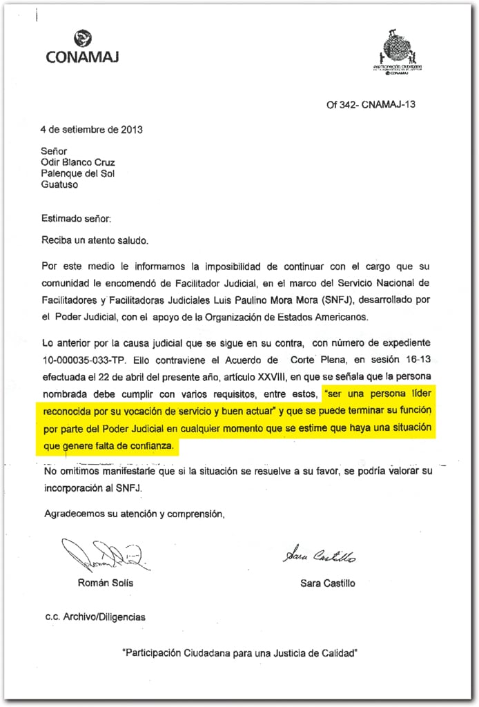 Sin embargo, el 4 de setiembre, la Comisión Nacional para el Mejoramiento de la Administración de Justicia (Conamaj), a cargo del Programa de Facilitadores, le notificó de la “imposibilidad de continuar con el cargo”.