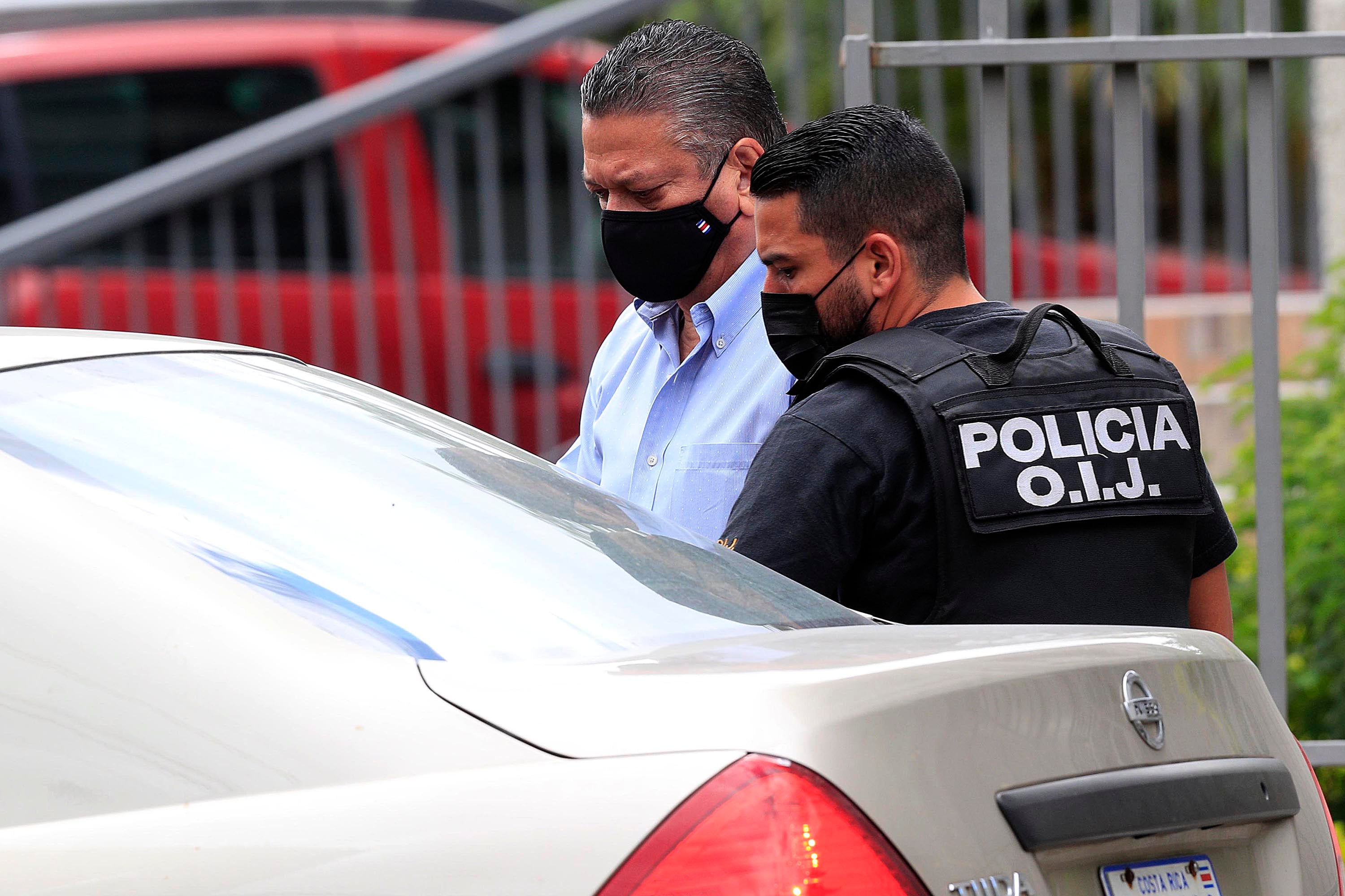 Araya salió esposado, sin manifestar nada a la prensa y acompañado por un custodio del Organismo de Investigación Judicial (OIJ), cuatro horas después de que los agentes ingresaran a su residencia en busca de pruebas.