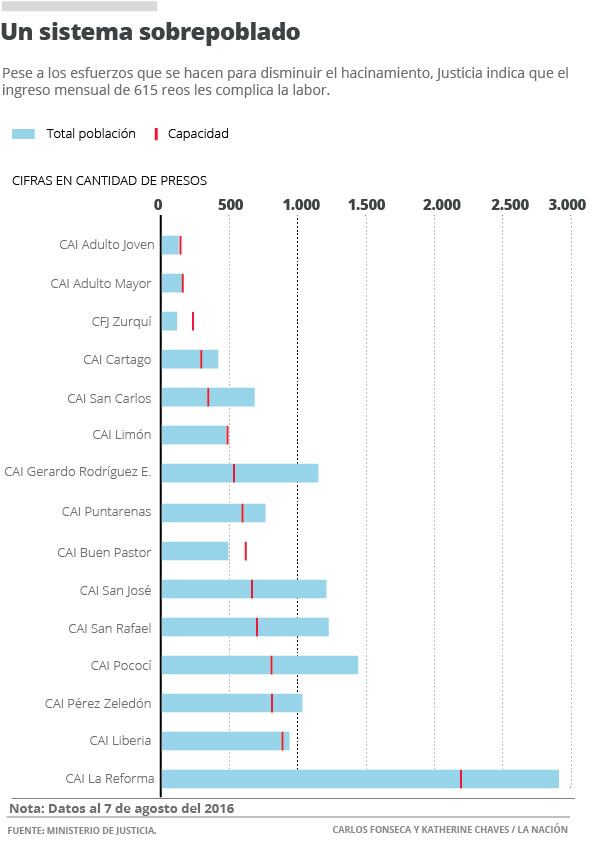 Mientras, en una resolución más reciente, emitida el 4 de agosto, la jueza de Ejecución de la Pena de Alajuela, Xinia Solís, aclaró que aunque el incremento de la población penal no es responsabilidad de la cartera, esta sí debe resolver la problemática del hacinamiento. “Parece que la Administración visualiza la situación como irremediable y se resigna, considerando que no es responsable del crecimiento desmedido que hay en la población penal”, expresó Solís en el fallo en que prohibió el ingreso de más reos al ámbito B de la cárcel La Reforma, en Alajuela.