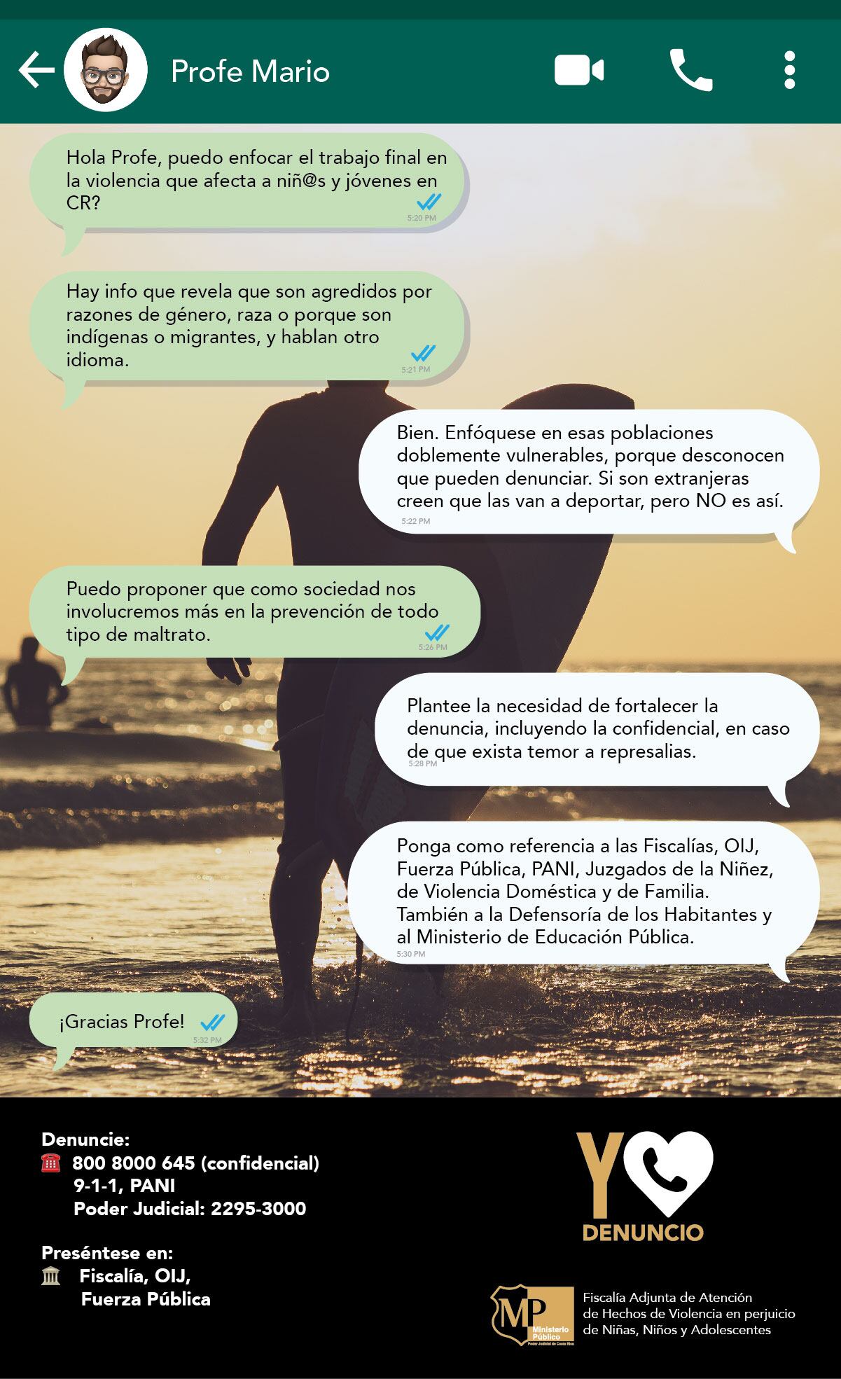 “Muchas de las denuncias ingresan por el MEP (Ministerio de Educación Pública) porque los niños y muchachos revelan lo que ocurre al orientador o a su maestra de confianza. Ahora que todos están confinados es complicado, pero existen estos enlaces con gente que conoce bien el trabajo de la Fiscalía y por ello se atreven a denunciar”, apuntó.