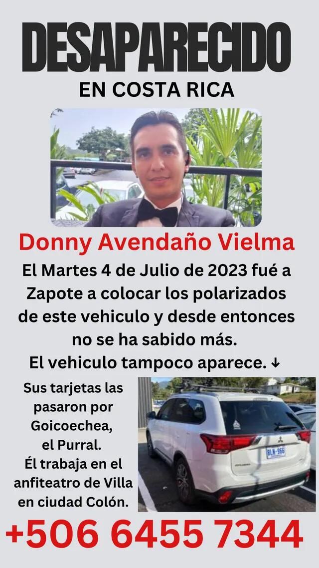 El 4 de julio, Donny, de 40 años, tenía el día libre en su empleo en el Anfiteatro La Villa, en Ciudad Colón, así que aprovechó para ir a polarizar su carro en un local comercial en Zapote, y desde entonces se perdió su rastro. Su mamá, Alide Vielma, quien reside temporalmente en Chile, está a ciegas y no sabe qué ha pasado con la investigación.