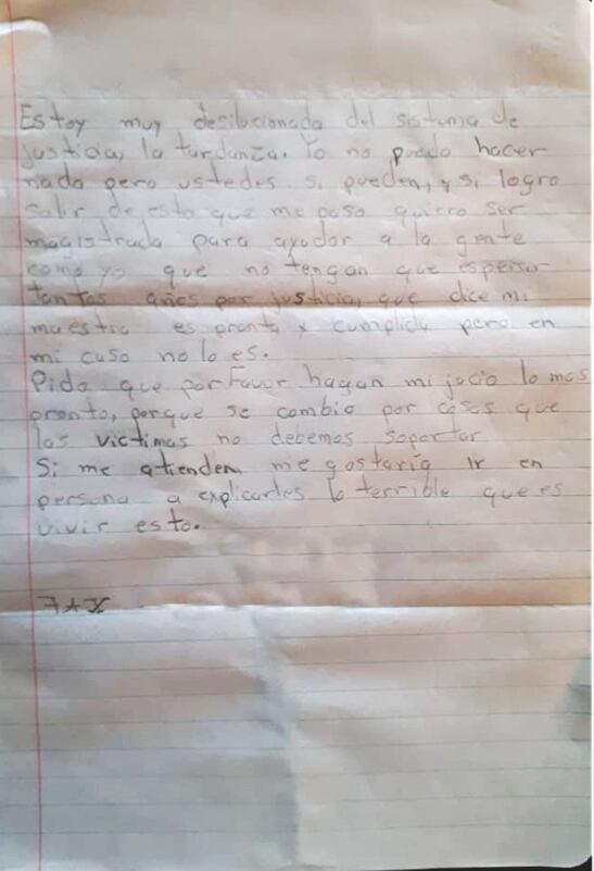 “Pido que por favor hagan mi juicio lo más pronto, porque se cambió (de fecha) por cosas que las víctimas no debemos soportar. Si me atienden, me gustaría ir en persona a explicarles lo terrible que es vivir esto”, manifestó.