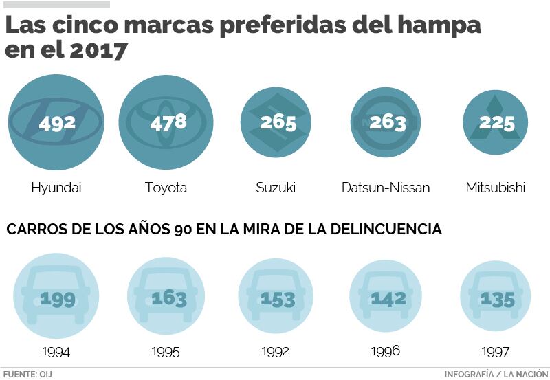 En tanto, los vehículos de los años 90 son los más seleccionados. Los datos del OIJ muestras que en el 2017 se robaron 199 de 1994, 163 de 1995, 153 de 1992, 142 de 1996 y 135 de 1997.