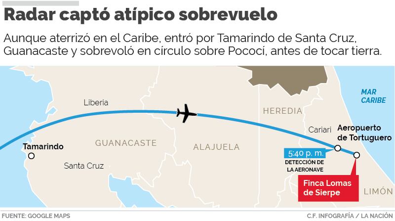 Soto indicó que, de forma preliminar, se maneja que la avioneta ingresó por Tamarindo y atravesó el país hasta llegar a ese aeródromo. El jerarca se mostró extrañado, puesto que, según dijo, esa no es una “ruta usual”.