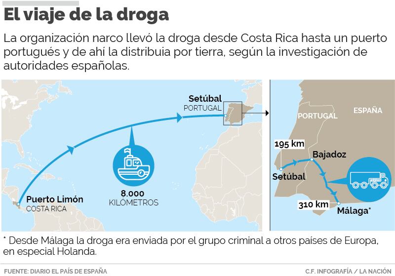 El grupo criminal usaba una compañía que importaba fruta desde Costa Rica como fachada para sus operaciones, informaron las autoridades. La cocaína iba escondida entre las cajas de bananos que llegaban al puerto de Setúbal, en Portugal, y era transportada en camión hasta Málaga, Andalucía, al sur de España.