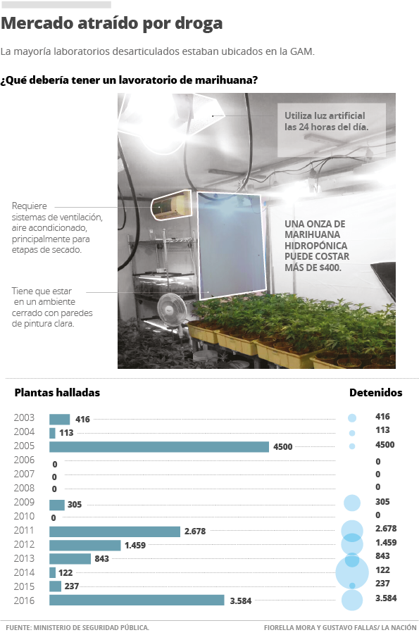 La primera vez que un espacio de este tipo fue detectado en el país ocurrió en el 2003, cuando se detuvo, en San Pedro de Montes de Oca, San José, a un costarricense y a un canadiense, quienes tenían un laboratorio hidropónico, donde se decomisaron 416 plantas de marihuana, 13 kilos de capullos de flor y 12 kilos de picadura.