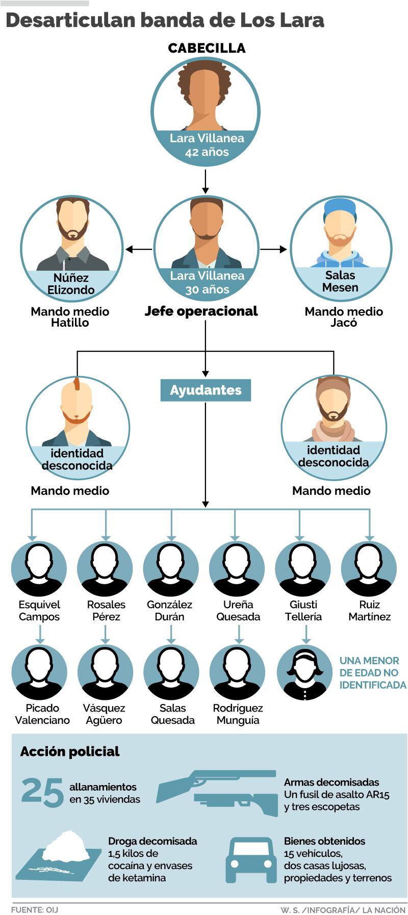 Dos hermanos de apellido Lara, de 43 y 30 años, figuran como presuntos líderes del grupo, según las investigaciones. El mayor es considerado como el que dirigía las acciones delictivas, mientras que su hermano era el jefe operacional.