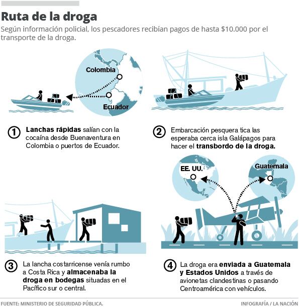 La droga que trasegaba esta organización era transportada en embarcaciones que salían del puerto de Buenaventura, Colombia y desde Ecuador. Posteriormente, barcos pesqueros ticos las interceptaban para hacer el trasbordo y se encargaban de traerla hasta Costa Rica para luego enviarla a Guatemala y Estados Unidos con ayuda de avionetas clandestinas o por vía terrestre.