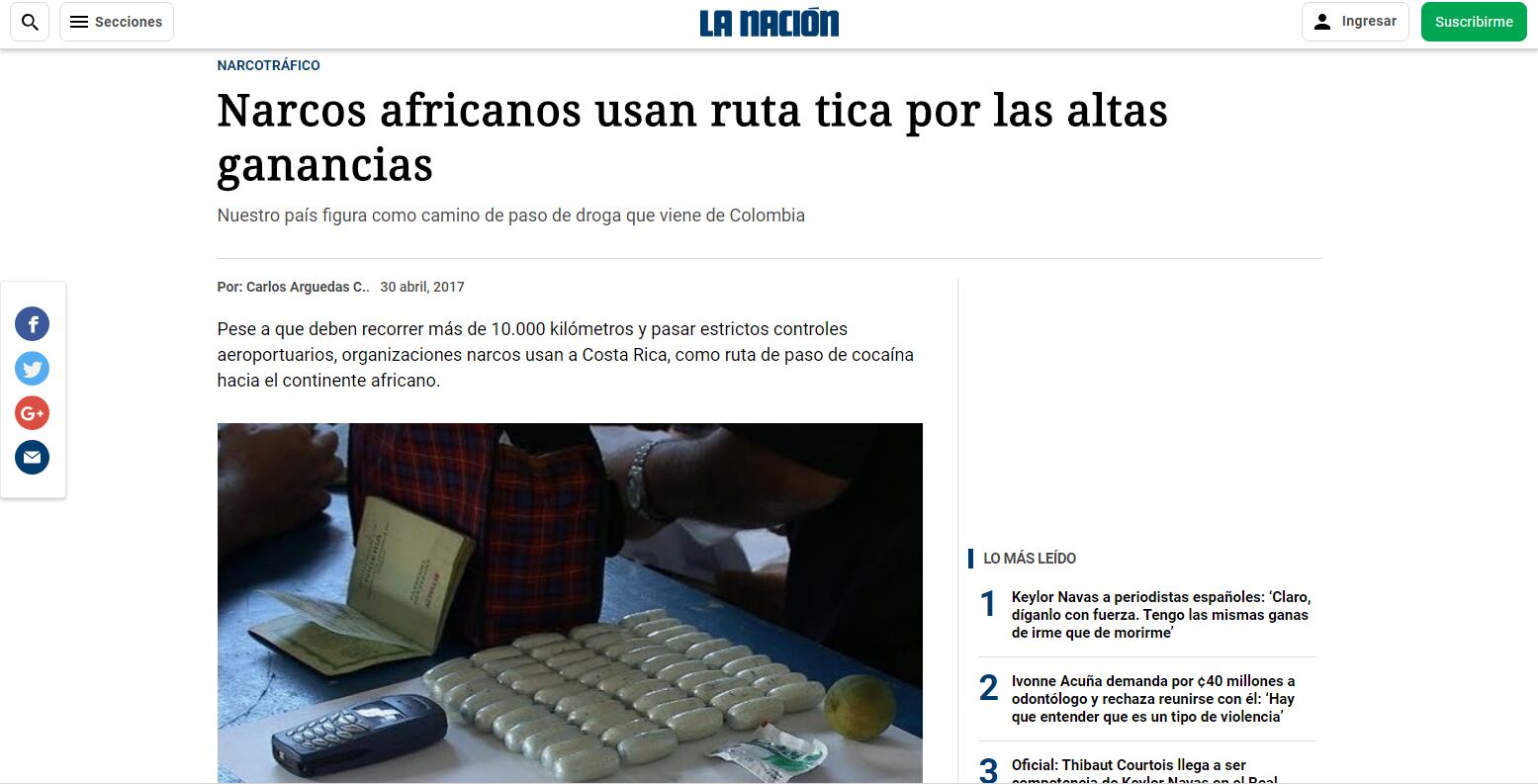 Una meticulosa investigación del periódico La Nación que desnuda la problemática del narcotráfico en Costa Rica y sus distintas vertientes, fue seleccionado por el consorcio Grupo de Diarios de América (GDA) como el ganador de la categoría Reportaje Noticioso de Investigación, en su sexta edición de Premios de Periodismo.