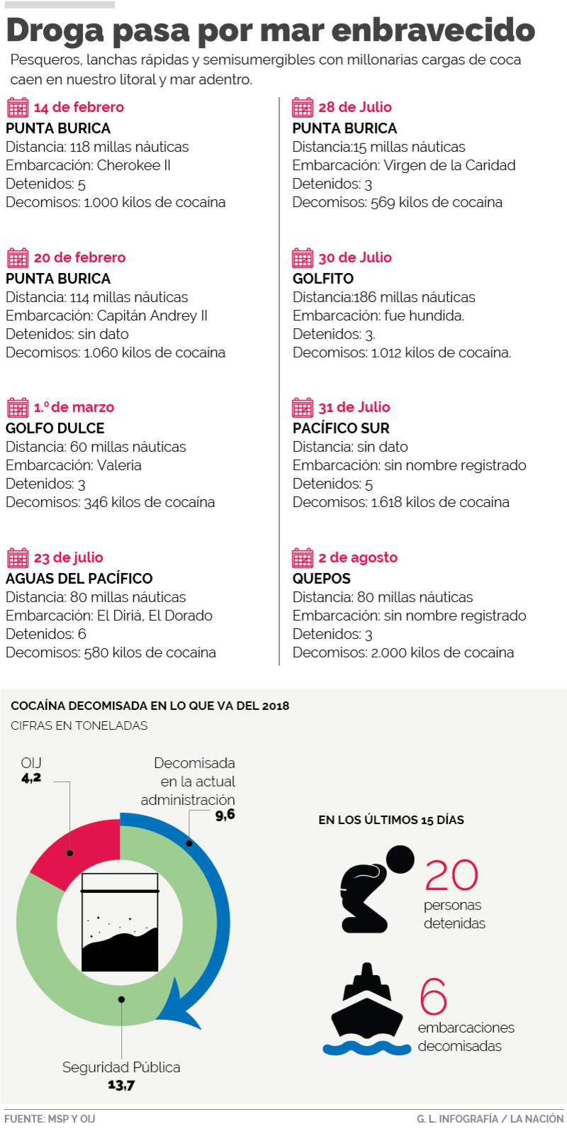 Solo en las últimas dos semanas, las autoridades han logrado incautar 6,5 toneladas de cocaína en cinco lanchas que ingresaron al al mar patrimonial (370 kilómetros a partir del mar territorial) o al mar territorial (22,2 kilómetros desde la costa) costarricenses.