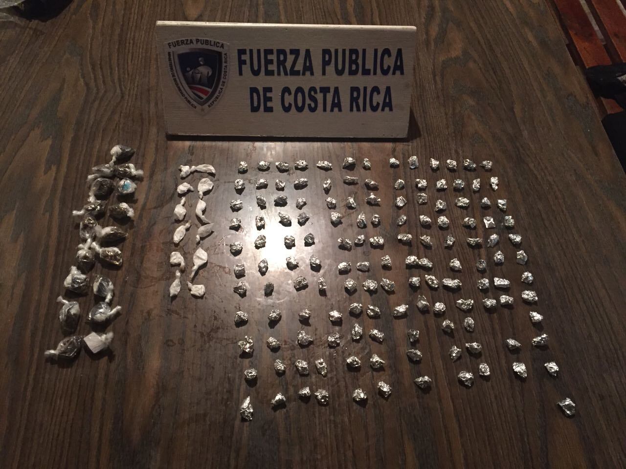Oficiales de la Fuerza Pública detuvieron, la madrugada de este domingo, a un menor de 14 años con una bolsa que contenía piedras de crack, puchos de marihuana y dosis de cocaína, todo valorado en ¢200.000.