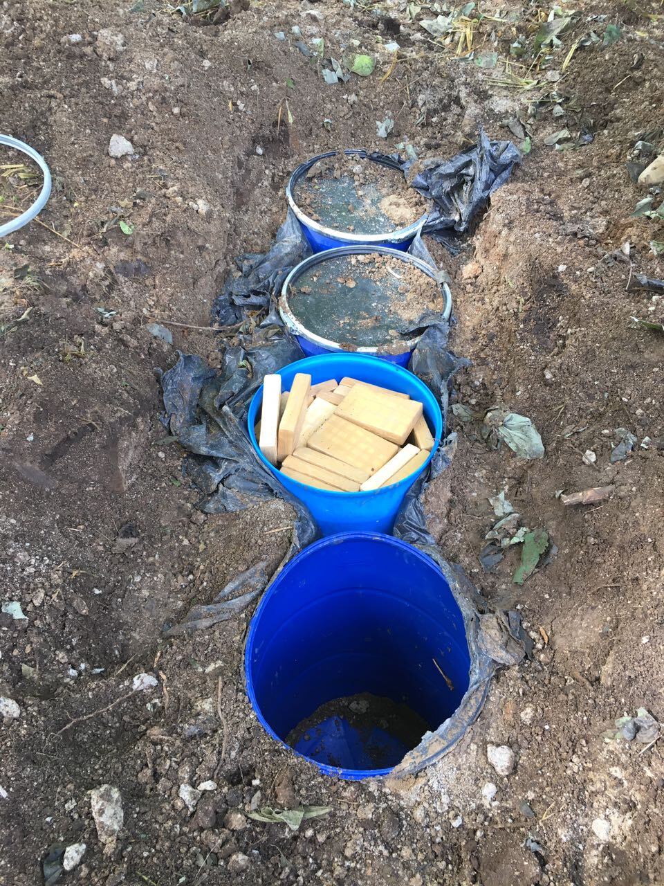 Una vez que los oficiales inspeccionaron la propiedad, encontraron cuatro estañones recubiertos con plástico, enterrados y cargados con paquetes de cocaína, así como un saco con la misma droga.