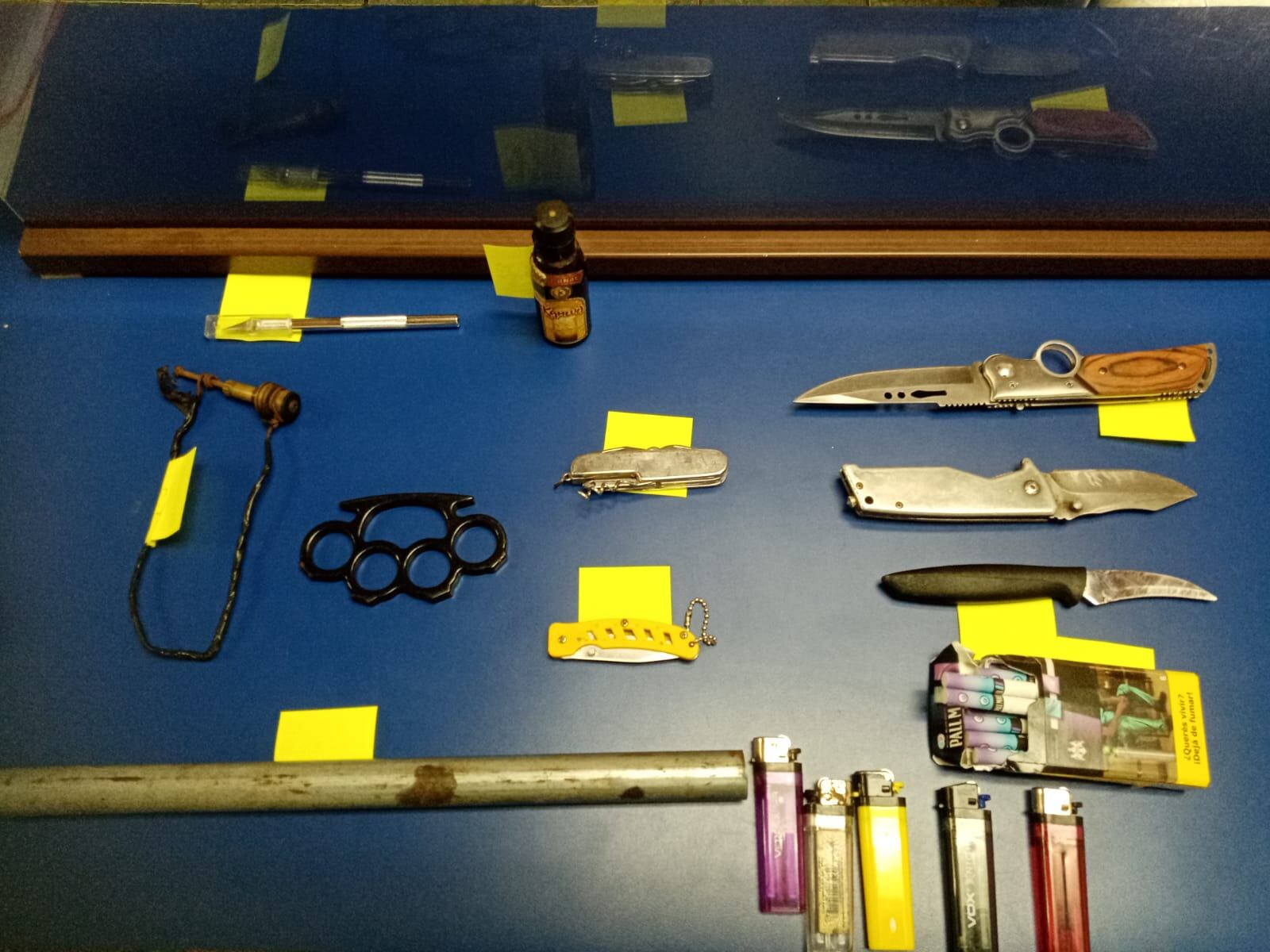 En un colegio en San Isidro de Alajuela, la Fuerza Pública también decomisó este viernes algunos objetos punzocortantes como cuchillas, navajas, cigarros, encendedores y una botella de alcohol.