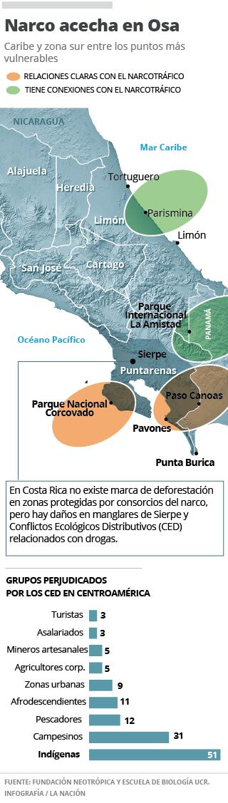 Aunque en nuestro país, a diferencia de otras naciones del área, no se detectó huella de deforestación relacionada con el narco, salvo en los manglares, Aguilar dijo que hay conflictos por actividades ilegales, como la minería y la caza ilegal, en sitios como el Parque Nacional Corcovado en Osa.
