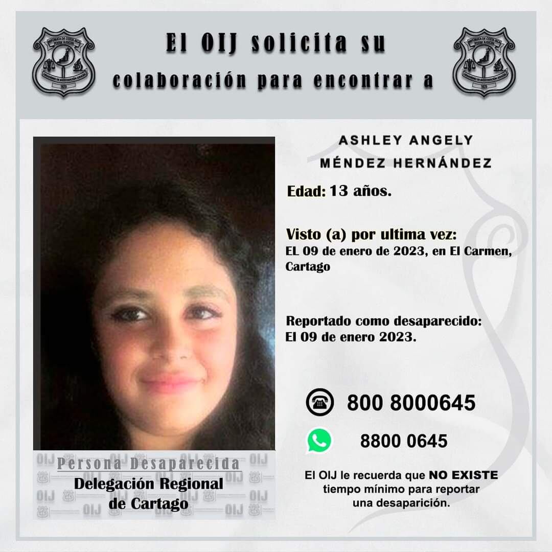 Ashley Méndez Hernández se encuentra desaparecida desde el lunes 9 de enero, a loas 8:30 a. m. cuando salió de su casa en El Carmen de Cartago hacia la casa de sus abuelito, a un kilómetro de distancia.