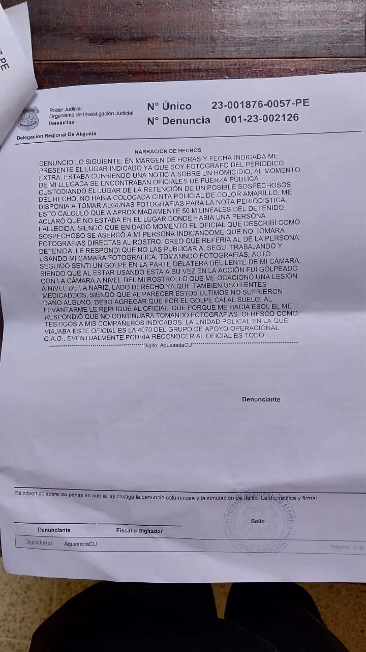 Mauricio Aguilar ya presentó una denuncia ante el Organismo de Investigación Judicial (OIJ) por las agresiones sufridas, bajo el expediente 23-001876-0057-PE. Comentó que es lamentable que la propia Policía dificulte la cobertura de los homicidios en un momento tan delicado como el actual, con el alza de asesinatos en todo el país y la urgencia de acciones de parte del Gobierno.