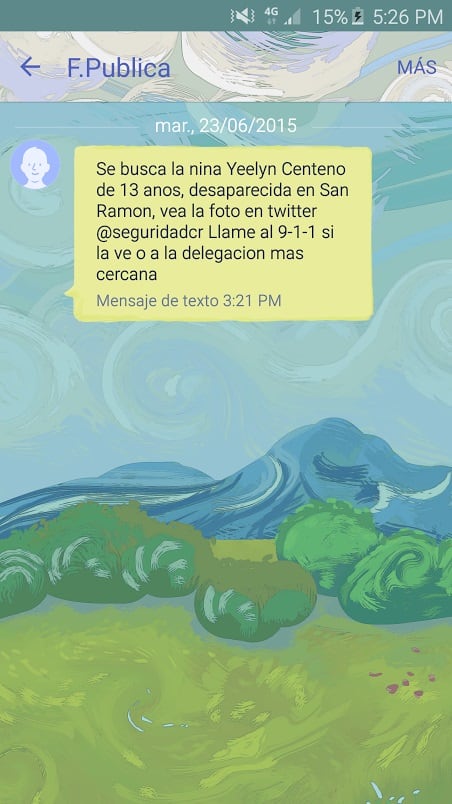 En ese mensaje de texto se informó a los clientes del Instituto Costarricense de Electricidad acerca de la desaparición de la niña de 13 años, cuya fotografía podían ver en la cuenta oficial de twitter @seguridadcr. y pedían reportar cualquier información al 911 o a la delegación policial más cercana.