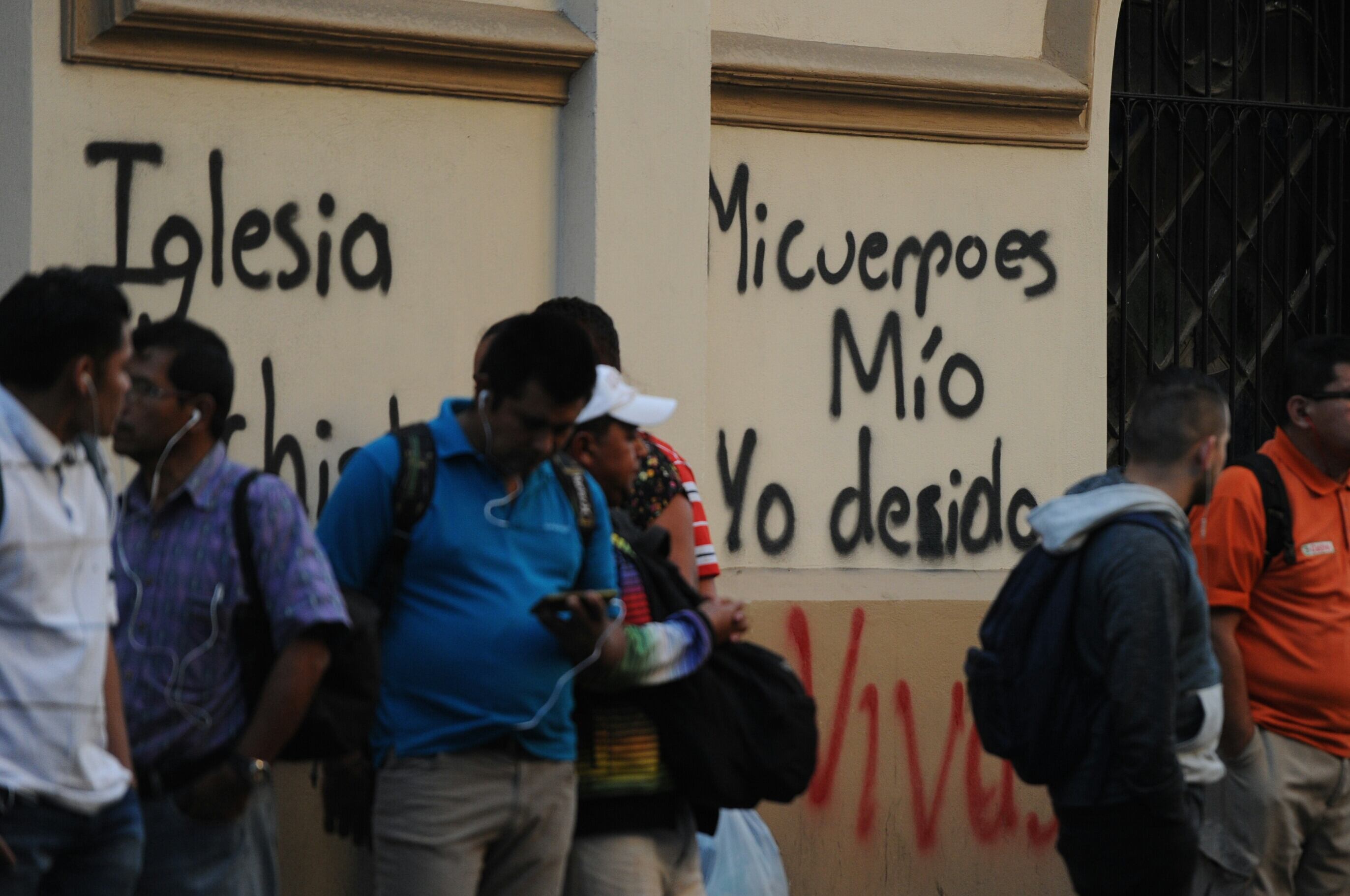 En la parroquia de Barrio Luján, el sacristán Pablo Elizondo Solís explicó que fue necesario el uso de solventes para eliminar un mensaje dejado en la entrada principal, referente a los ovarios.
