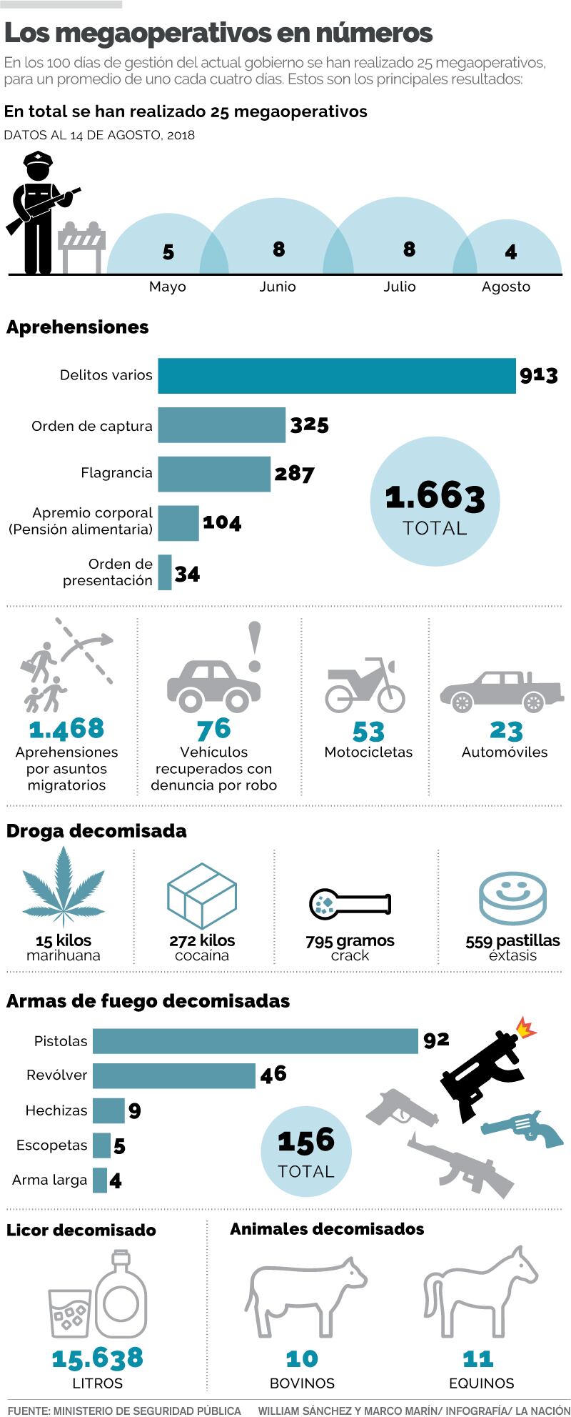 Según los datos brindados por el Ministerio de Seguridad, en los 25 megaoperativos que se han realizado hasta el pasado fin de semana, se han logrado 1.663 aprehensiones, de las cuales 325 son por orden de captura y 287 son por delitos que se cometían en flagrancia. Además, se han dado 1.468 aprehensiones de foráneos en condición irregular y confiscado 156 armas de fuego.