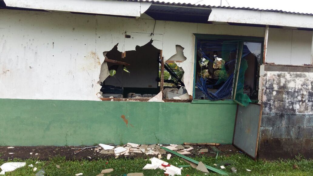 En el lugar quedaron escombros, así como vidrios quebrados y otros reventados por efecto del calor, lo mismo que paredes quebradas por piedras, a raíz del enfrentamiento.