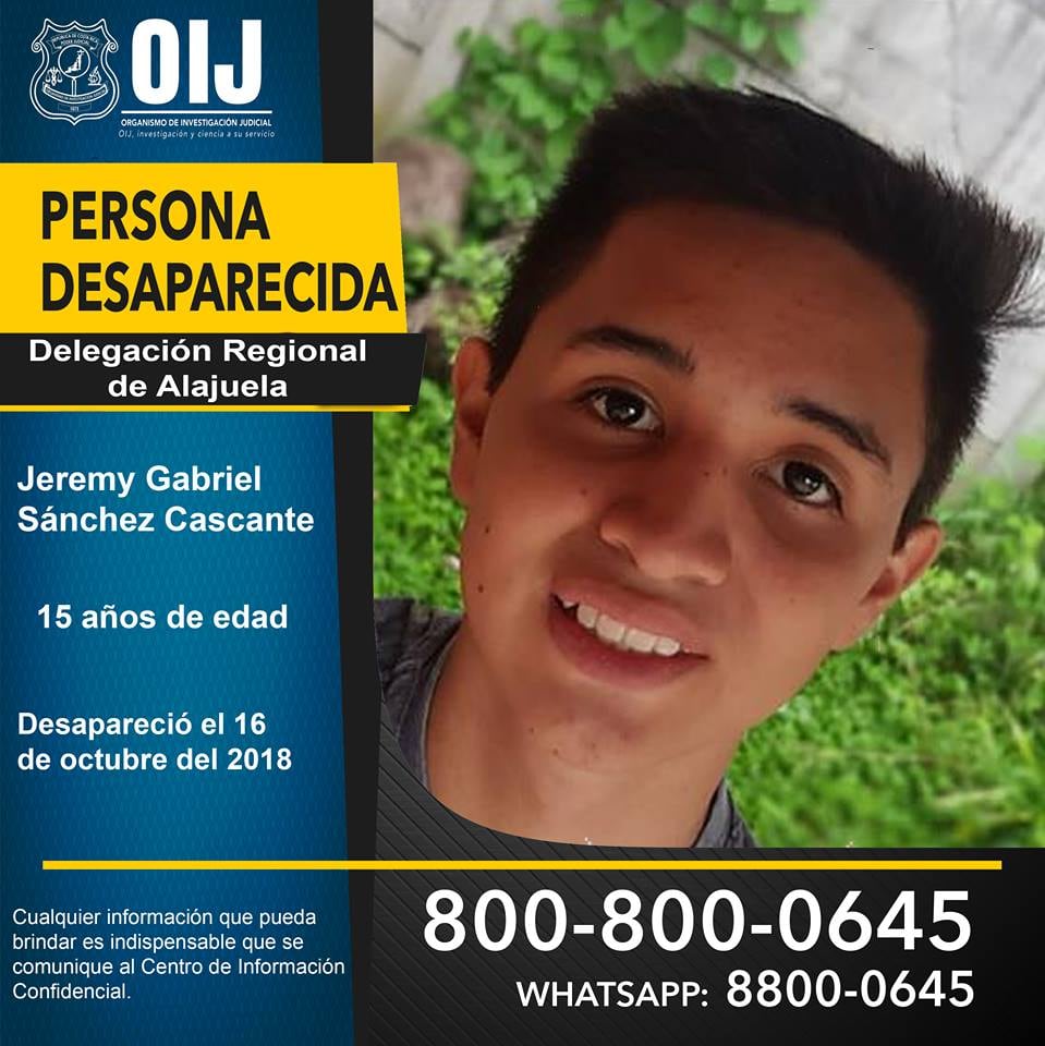 Documentos personales de Jeremy Gabriel Sánchez Cascante, un estudiante de 15 años, desaparecido desde el 16 de octubre en Turrúcares de Alajuela, fueron encontrados por oficiales del Organismo de Investigación Judicial (OIJ) en un allanamiento en una casa en San Diego de La Unión.