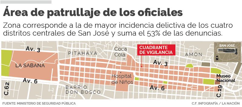 Será en esa área, de unos seis kilómetros que se concentrará la labor de la Policía Metropolitana, un nuevo grupo de la Fuerza Pública que fue presentada oficialmente este lunes con la presencia del presidente de la República, Luis Guillermo Solís; el viceministro de Seguridad Pública, Juan José Andrade; y el alcalde capitalino, Johnny Araya.