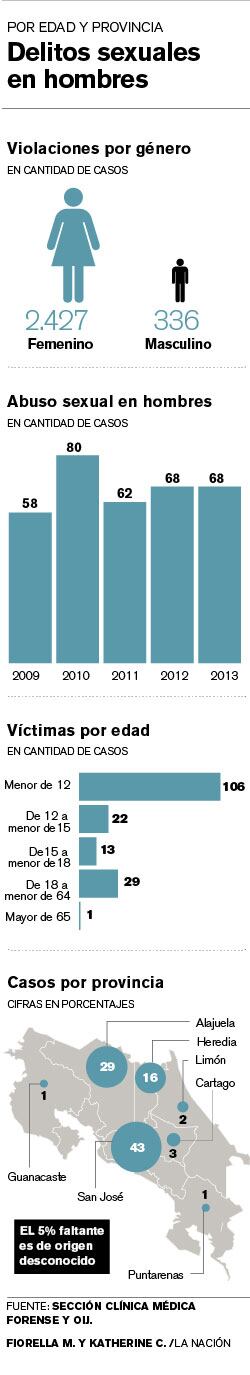 De acuerdo con el informe entregado a solicitud de La Nación , del 2009 al 2013, la entidad recibió 2.763 denuncias por violación, de las cuales 336 fueron interpuestas por hombres en calidad de víctimas.