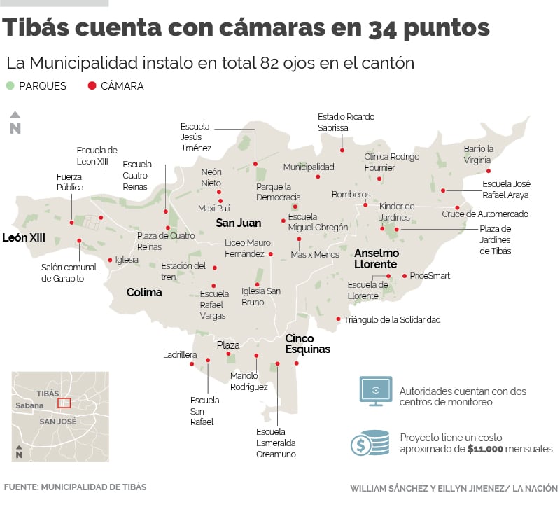 Bajar la incidencia criminal en el cantón es el objetivo que persigue la Municipalidad de Tibás al instalar 82 cámaras de seguridad en los alrededores de centros educativos y parques, así como entradas y salidas de la comunidad.
