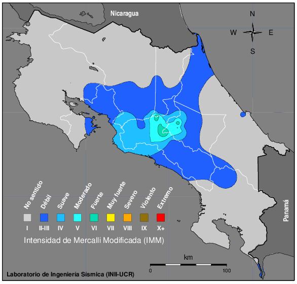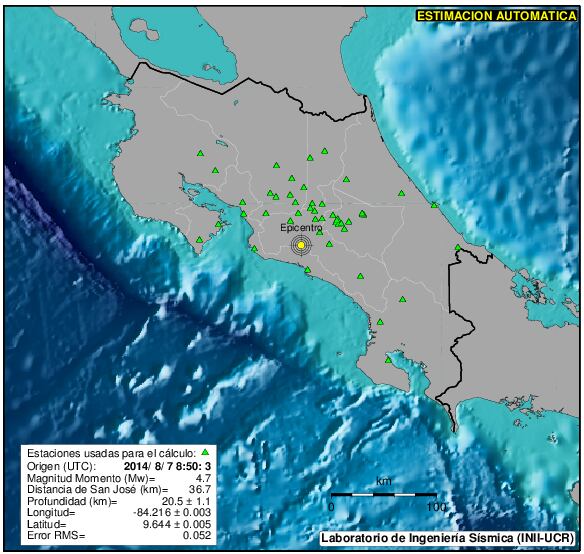Esta información contrasta levemente con la provista por el Observatorio Vulcanológico y Sismológico de Costa Rica (Ovsicori) de la Universidad Nacional. Este centro de estudio ubica el sismo 20 km al este de San Marcos de Tarrazú y con magnitud de 4.8 grados .