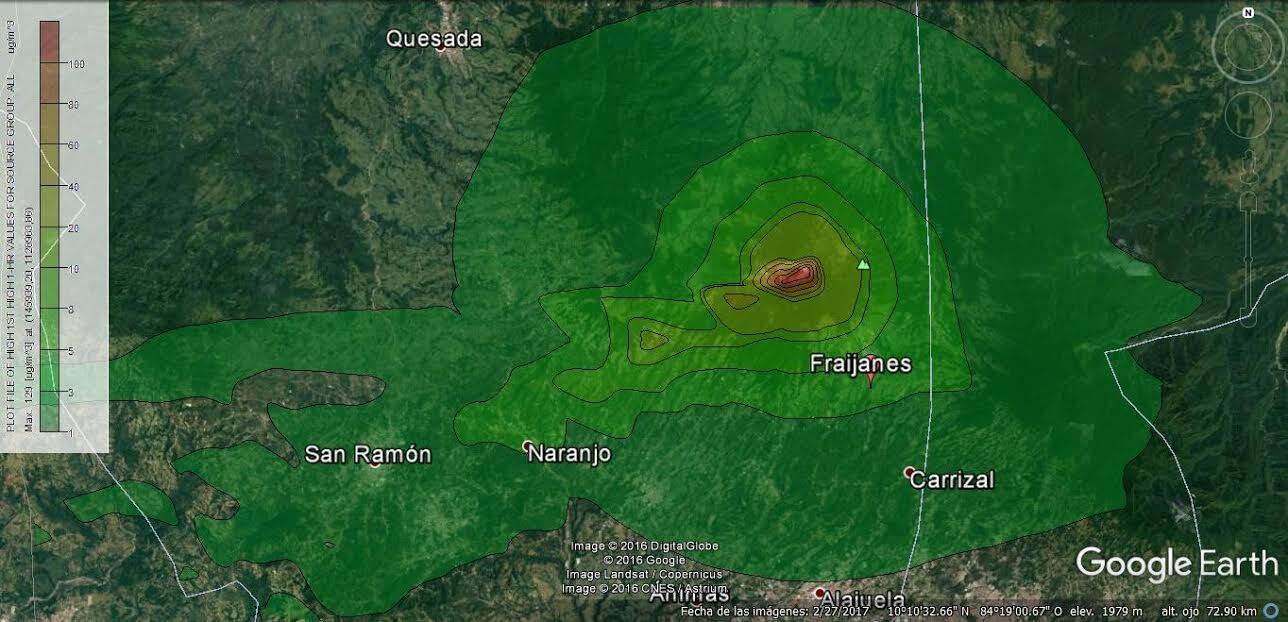 Un mapa de dispersión elaborado por el Laboratorio de Química de la Atmósfera de la Universidad Nacional (LAQAT-UNA) estima las emisiones llegarían a afectar zonas como Bajos del Toro, Zarcero, Pocosol, La Tigra, Florencia, San José de la Montaña, Naranjo, San Ramón, Palmares, Sarchí, Grecia, San Luis, Finca Inés, Alto Palomo, Altura, Fraijanes, Parque Nacional Volcán Poás, Carrizal, San Pedro de Poás, Santa Bárbara, Pozo Azul, entre o...tros lugares cercanos.