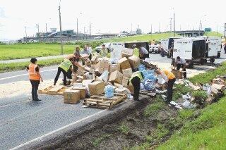 Por ello, la Policía del Tránsito cerró parcialmente la carretera mientras funcionarios del aeropuerto recogían productos. Entre los artículos había jugos, botellas de agua y gaseosas.