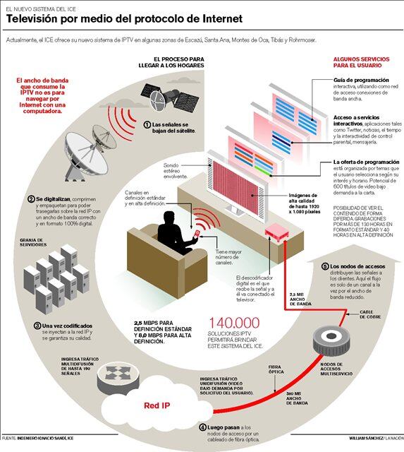 El servicio de IPTV del ICE no requiere un televisor especial y actualmente está disponible en algunos sectores de Santa Ana, Escazú, Rohrmoser, Tibás y Montes de Oca. Los paquetes arrancan en los $38.
