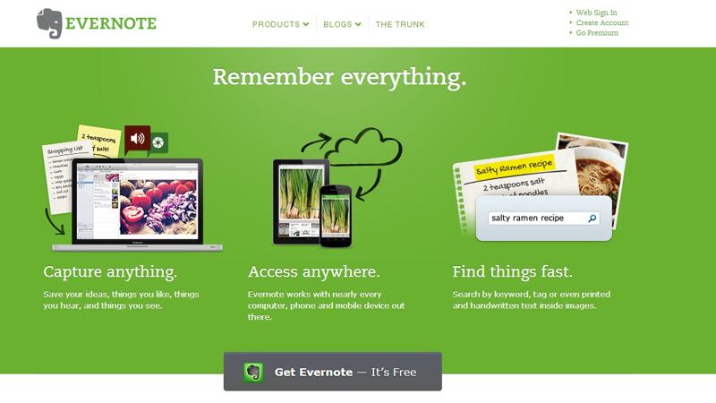 Evernote es una aplicación de organización personal donde los usuarios pueden almacenar notas, textos, enlaces de Internet, artículos e imágenes para fines personales o laborales. Una cuenta premium cuesta $5 al mes o $45 el año.