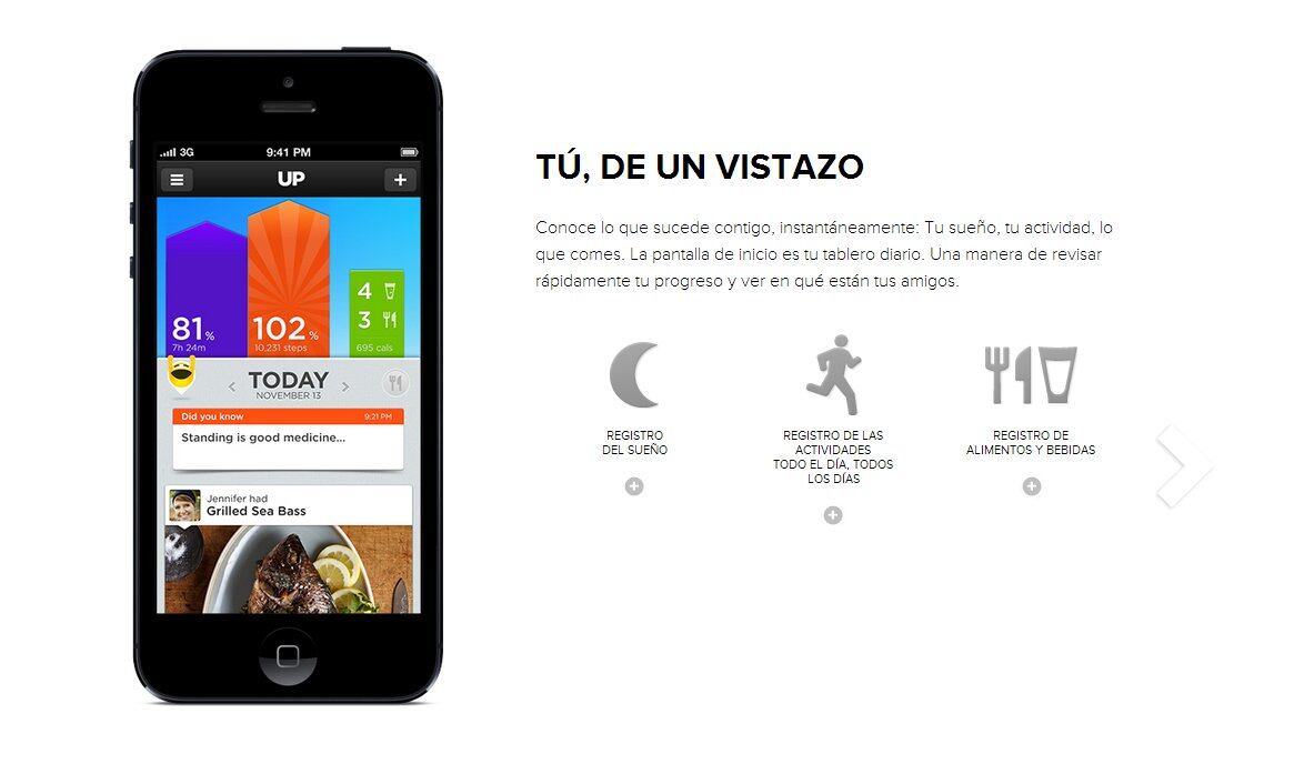 Las pulseras UP reúnen datos sobre cómo se mueven, duermen y comen los portadores a través de sensores y procesadores. La transmisión de esa información a un iPhone, iPad o iPod Touch, conectados a Internet , permite, a través de aplicaciones, evaluar el comportamiento del usuario y ver si se cumplió el objetivo de actividad diaria.