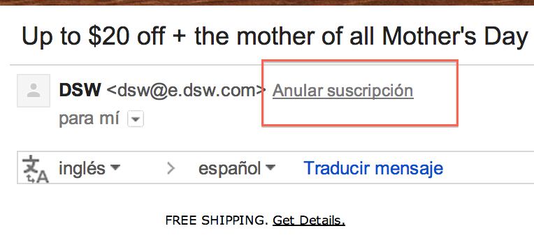 En adelante, si el remitente de un correo promocional, o de una red social o un foro de discusión incluye con el mensaje un enlace para desinscribirse (un botón o un link con la palabra "unsubscribe"), Gmail pondrá esa opción en la parte superior del mensaje junto a la dirección de correo electrónico de quien lo envió.