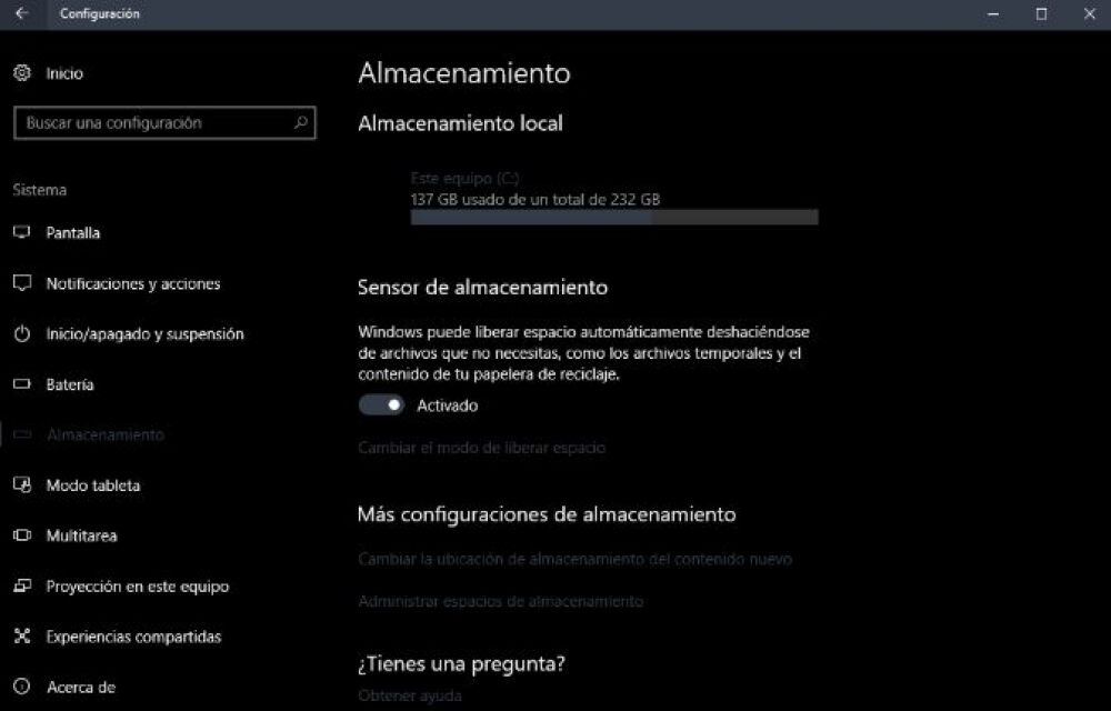 Desde ahí puede activar el Sensor de almacenamiento y Windows limpiará la basura acumulada de forma automática, ni siquiera tendrá que usar el Liberador de espacio en disco manualmente cuando esté con el espacio de memoria al tope.