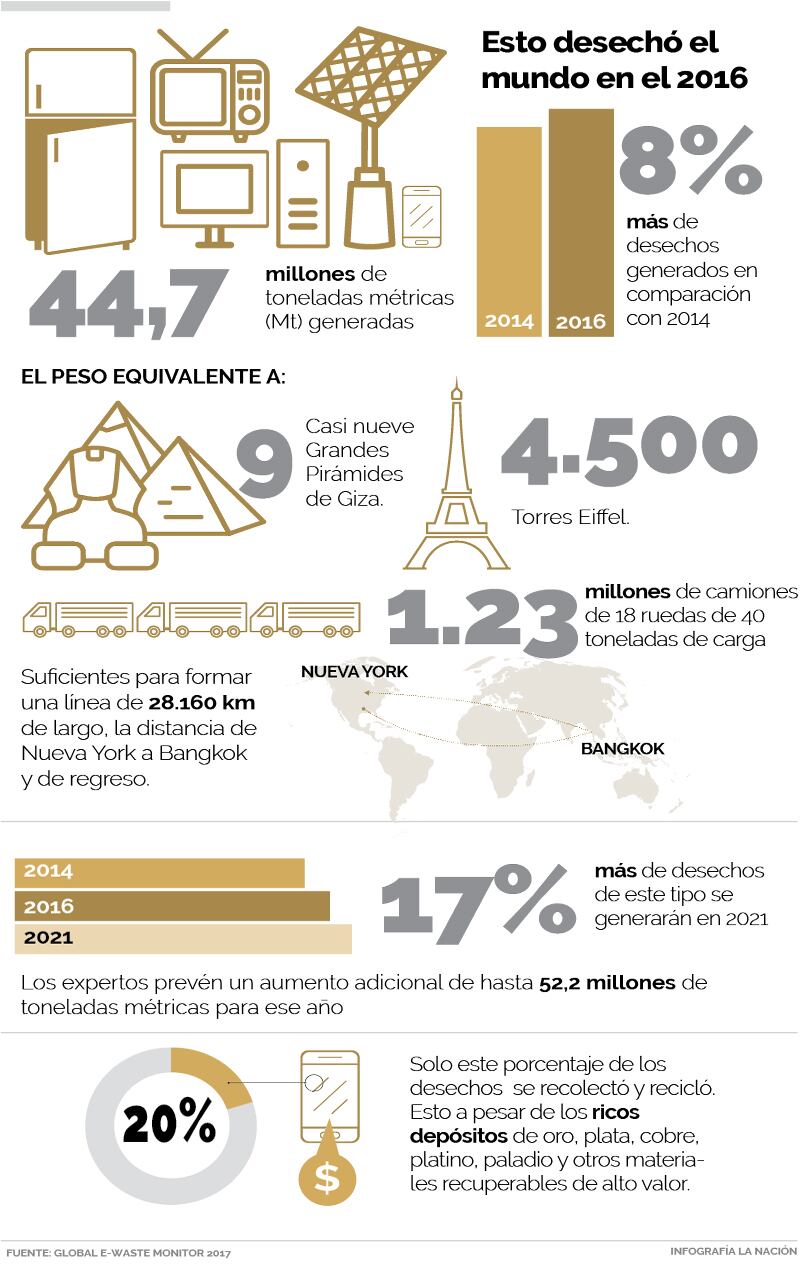 Si en su casa desecharon pantallas, lámparas o equipos de telecomunicaciones el año pasado, usted fue uno de los costarricenses que sumó a las 48 kilotoneladas (48.000 t) de basura electrónica generadas durante 2016 por el país, lo que equivale a unos 9,7 kg por habitante.