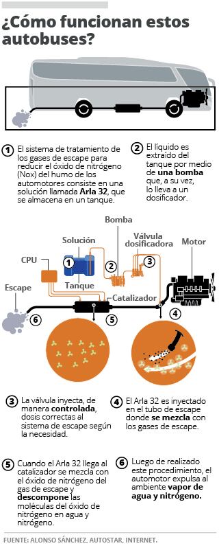 “Se hace el tratamiento de los gases de la mufla. Ahí inyectamos, con la ayuda de un sistema electrónico, úrea (también conocida como agente reductor líquido automotriz Arla 32), una disolución de agua con amoníaco al 32,5%. Al mezclarse con el gas del escape, el amoníaco tiene la cualidad química de descomponer las moléculas del óxido nitroso, que es el principal contaminante en los vehículos diésel”, detalló Sánchez.