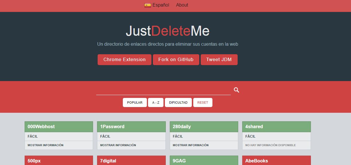 Con una propuesta similar, Just Delete Me también ofrece un directorio con enlaces para darse de baja en muchos servicios online, todos identificados con una clasificación de colores para identificar el nivel de dificultad para gestionar la eliminación de la cuenta.