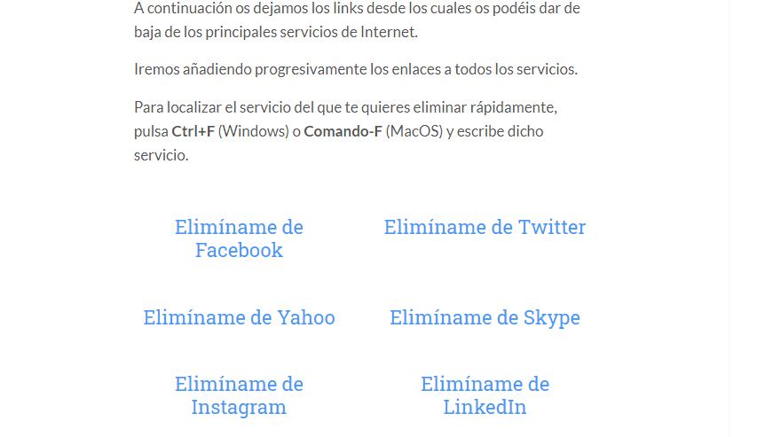 Para este tipo de casos están los directorios que recopilan los enlaces directos para gestionar la baja del servicio online. Con un listado acotado pero efectivo, Derecho de la Red ofrece 20 links en Elimíname, un compilado para gestionar la baja en sitios como Facebook, Twitter, Medium, Google, LinkedIn y muchos otros servicios.