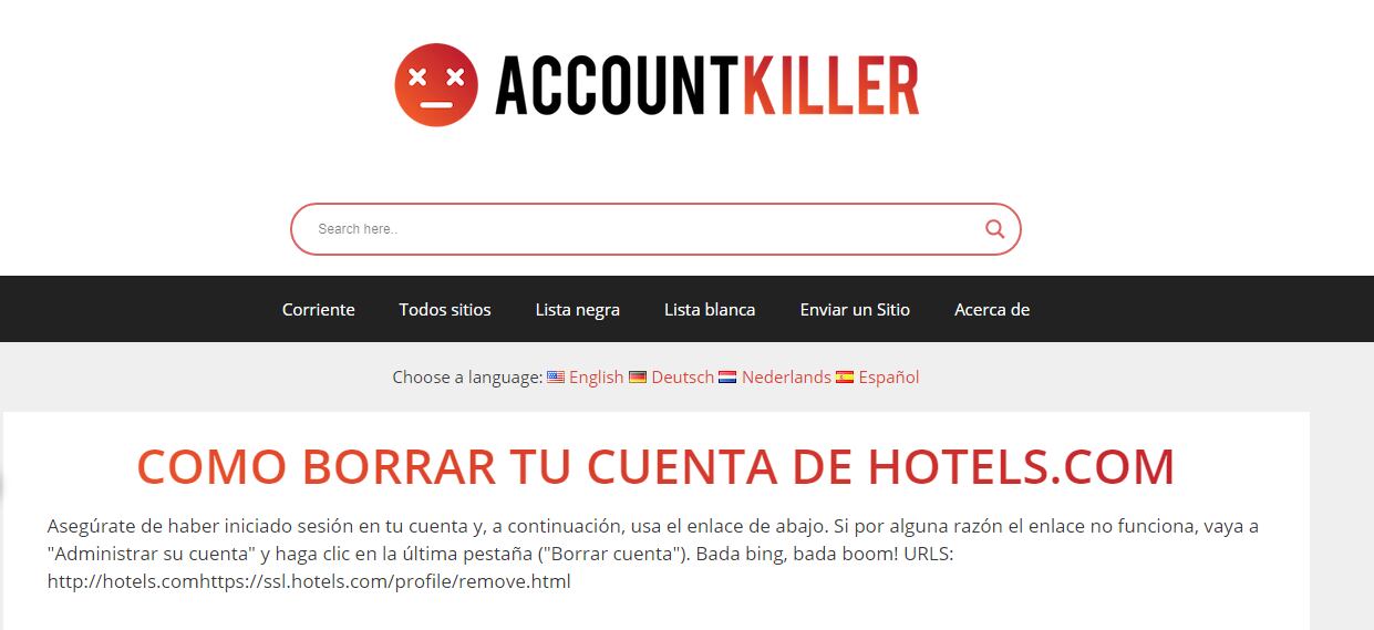 Por su parte, Account Killer es un sitio que ofrece las instrucciones directas para que los usuarios puedan dar de baja su presencia en la red y en sitios como Facebook, Google o Instagram. También dispone de clasificaciones para identificar servicios que impiden este proceso, como ocurre con Skype, que forma parte de la lista negra del sitio.