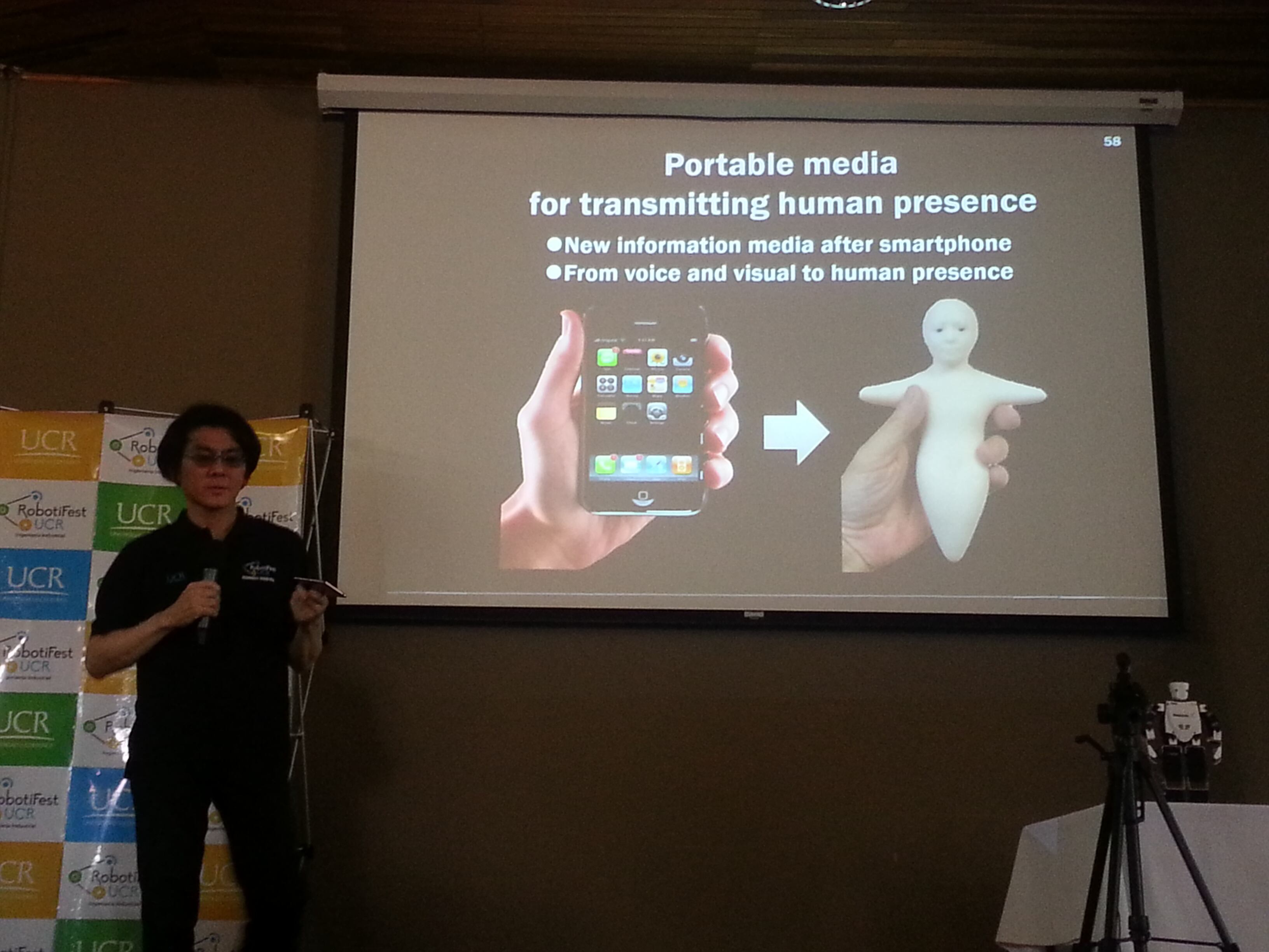 Además, aprovechó para mostrar ejemplos de cómo se utilizan los robots con aspecto muy similar al humano en Japón, por ejemplo, en las tiendas como dependientes y cuestionó ¿en qué criterio confiaría más el comprador, en el del robot o en el de la persona? Según él es muy problable que el del robot.