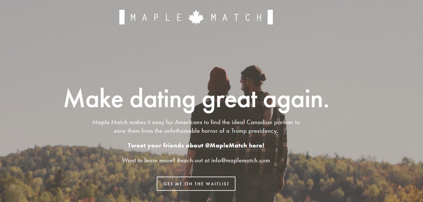 Se trata del sitio Maplematch.com, el cual orgullosamente exhibe en su página que hace "fácil para los estadounidenses encontrar el compañero canadiense ideal que les salvará del incomprensible horror de una presidencia de Trump".