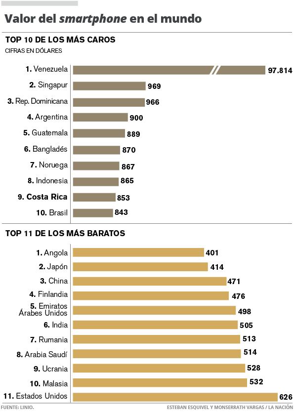 El listado es encabezado por Venezuela, donde este teléfono inteligente se compra por $97.813 (más ¢54 millones). El precio puede parecer risible o exagerado, pero según Linio, lo anterior se explica debido "a la inflación y a las restricciones a la importación que han tenido un gran impacto en el acceso de los consumidores al mercado".
