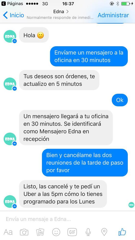 Cuando la persona desee que Edna le ayude a completar una tarea, solo deberá enviarle un mensaje al chatbot con su solicitud, escribiendo a la dirección http:m.me/heyedna, mediante su Facebook Messenger.