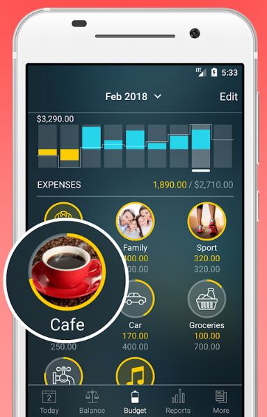De igual manera, cuenta con diferentes tipos de moneda, gráficos y reportes del estado financiero del usuario, la posibilidad de crear categorías personalizadas para cada gasto y sincronización con la nube.
