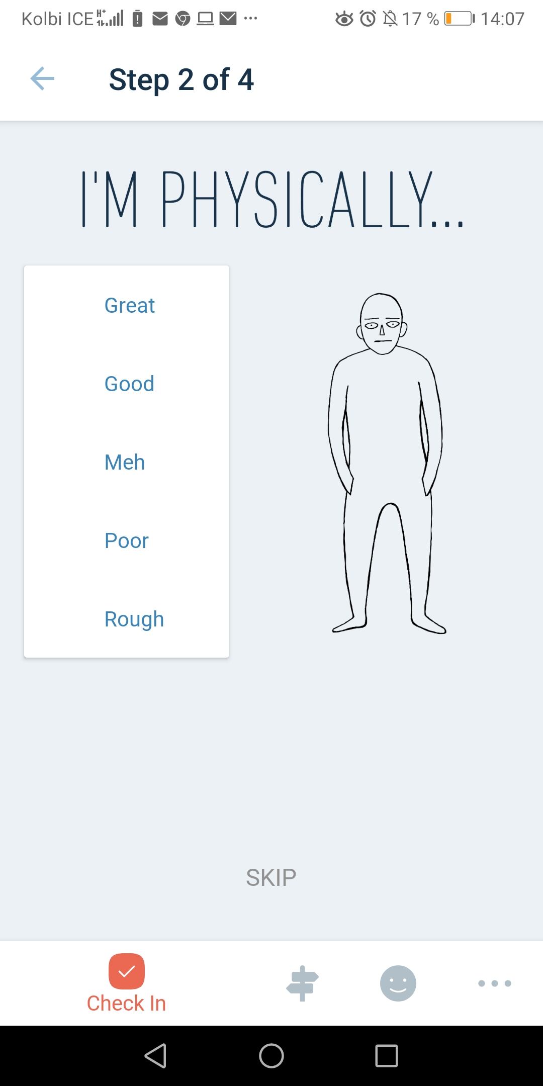 El primer paso es respirar. La app pide que se respire por 10 segundos para calmar la mente y poner los pensamientos en orden. Luego sugiere analizar en qué estado físico se encuentra la personas excelente, bueno, medio, malo o pésimo.