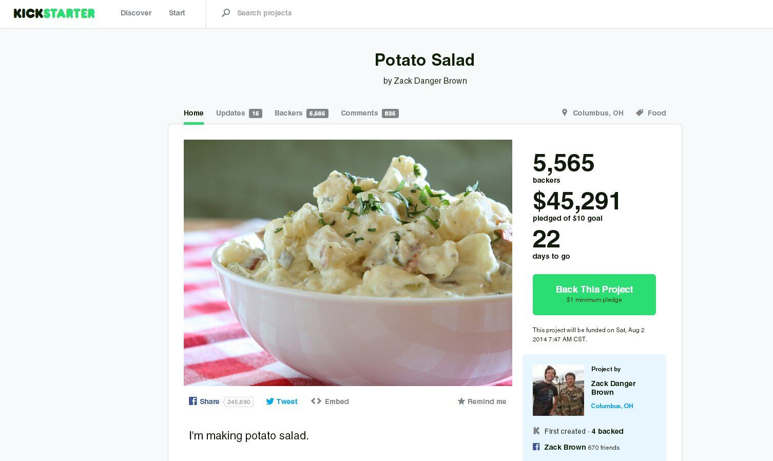 Esta semana, un proyecto publicado en Kickstarter aspiraba a recibir $10 para preparar una ensalada de papas.